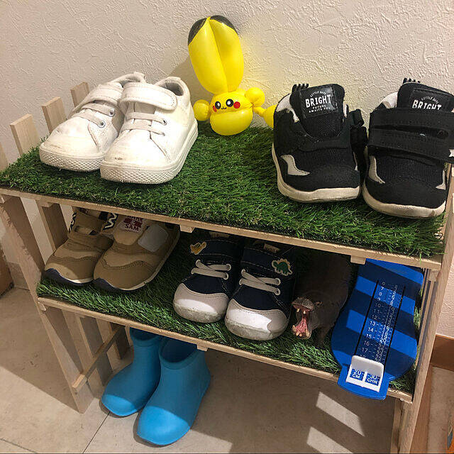 sotaさんはダイソーのすのこを使って、お子さん用のシューズラックをDIYされました。芝生風のマットを敷いているところがポイントです。時には靴を全部退けてから、おもちゃの車や動物を持ってきてお子さんが遊ぶこともあるのだとか。遊び場を兼ねた靴箱になっているそうですよ。