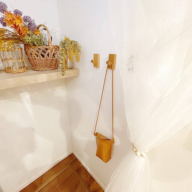 階段下収納に、壁に付けられる家具フックを取り入れたkyoro_homeさん。オーク材のフックがナチュラルな空間に良くお似合いです。実用性とデザイン性に優れた家具フックは、収納アイテムの枠を超えています。kyoro_homeさんのようにバックを掛けておけば、お出掛けするときにサッと持ち出せて便利ですね。