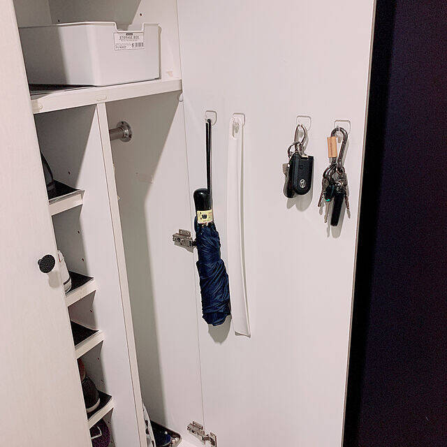 ユーザーさんが玄関小物の収納に使われているのは、スタンダードな形の「フィルムフック 固定タイプ」です。下駄箱の扉裏に取り付けて、靴べらや折りたたみ傘、鍵などを吊しています。クリアでシンプルなフックなので、たくさん取り付けてもすっきり。デッドスペースの活用にも、一役買っていますね。