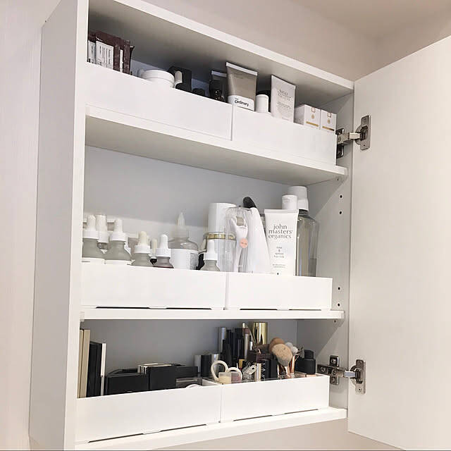 スキンケアアイテムはインテリア性の高い容器のものも多く、見せて収納するのもいいですよね。どこに何があるか分かりやすく、スムーズにスキンケアができるのもうれしいポイント。みなさんディスプレイのように、スキンケアアイテムを収納されていますよ。
