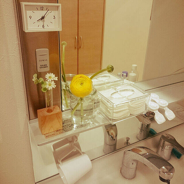 ポケットティッシュ用のクリアケースに、コットンを収納されているkyokoさん。使う時に、毎回フタを開け閉めしなくていいのが良いそうですよ。クリアケースは清潔感があるので、洗面スペースにはぴったりですね。ナチュラルな雰囲気のインテリアに、よく合っています。