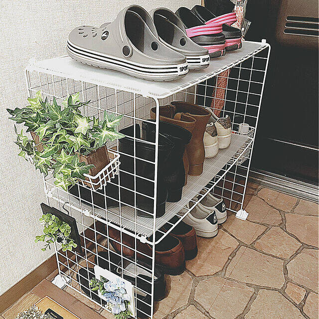 nemuさんはダイソーのワイヤーネットと結束バンドで、シューズラックをDIY。約1300円で作成できたそうですよ。手持ちの靴の高さに合わせて棚をアレンジできるのが、DIYの魅力です。外側にバスケットをかけて、ちょっとした飾りや収納スペースをプラスできるのは、ワイヤーネットならではのアイディアですね。