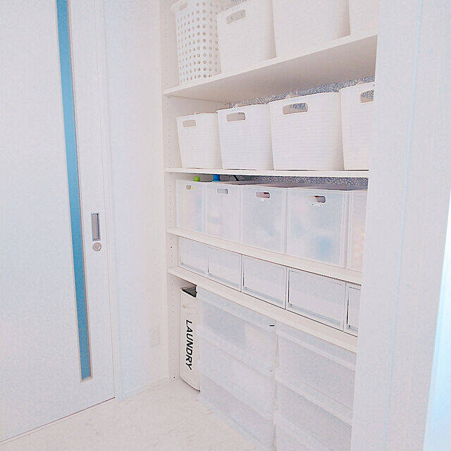 こちらはYuzu-hiさんの洗面所パントリー。ホワイトで統一された空間は清潔感がありますね。下から二段目を家族別収納として、無印良品のポリプロピレンケースを愛用されています。ホワイトグレーのカラーは中身を見せずに収納することができ、深型なので収納力も抜群ですよ。