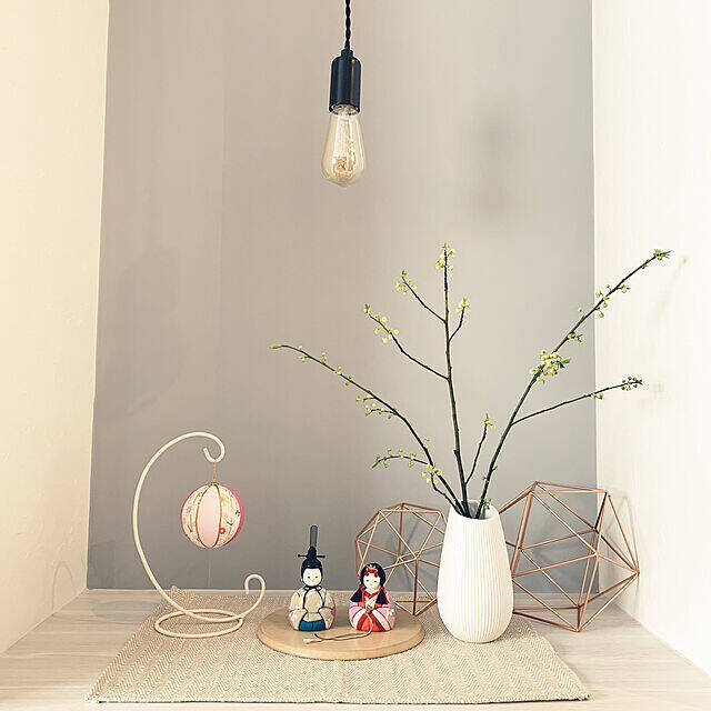 玄関に飾り棚を作っている、chikuwamuuuさん。ペンダントライトに、「エジソンバルブLED電球」のスパイラルロングを付けています。グレーのアクセントクロスがあるスペースを、エジソン電球が引き締めて見せてくれますね。