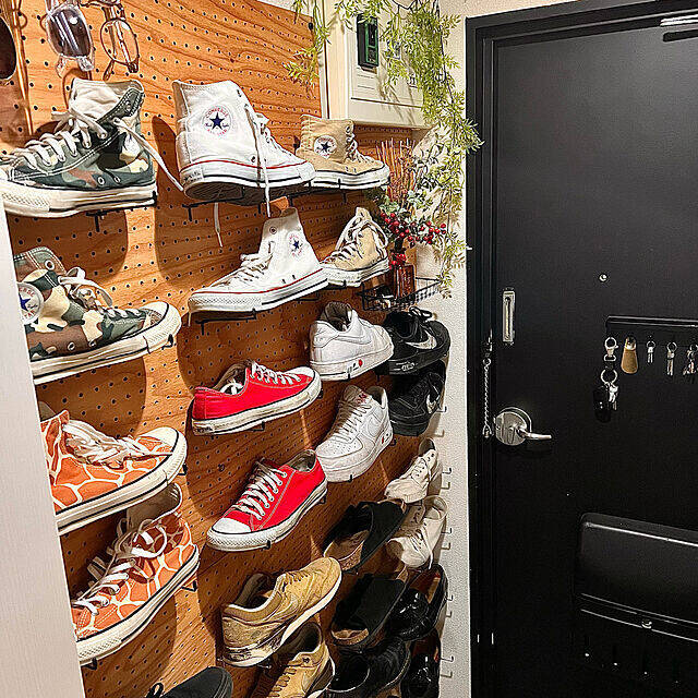 t_factory.tさんは、玄関の壁にスニーカーをディスプレイしています。有孔ボードに靴用のフックを使って収納していました。見た目もかっこよく、取り出しやすいので実用的ですね!靴屋を巡って、ディスプレイの参考にされたそうですよ。
