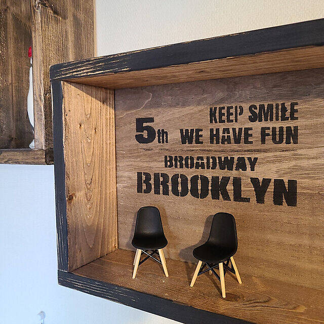 lovepeaceさんは木製の棚の中にセリアのミニチュアデザインチェアを2つ飾って、ディスプレイコーナーを作られました。ブラックのチェアと、棚に描かれた英文字との相性も抜群。クールでかっこいいディスプレイになっていますね。