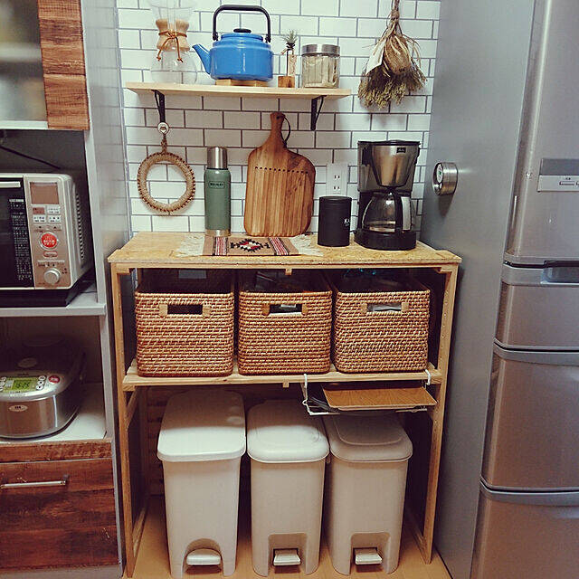 キッチンの収納に、ニトリの3段ウッドシェルフを活用していらっしゃるnaco.さん。ゴミ箱3つを収めたかったため、下の棚板は外して補強用の板としてうしろ側に取り付けたそうですよ。ラックの上には、ホームセンターで購入した板を載せました。ちょっとしたDIYを加えることで、さらに使い勝手をよくしています。