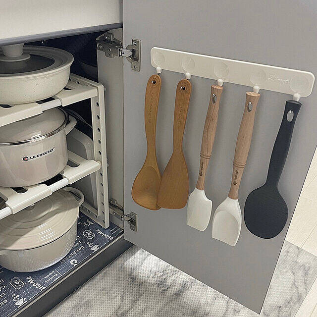 使いやすそうなキッチンのシンク下収納を紹介してくれたのは、naonaoさんです。デザイン性に優れたフックとキッチンツールとの組み合わせは、見た目もばっちりですね。実例のように、お鍋類の近くにキッチンツールを置いておくと、調理もスムーズにできそうです。