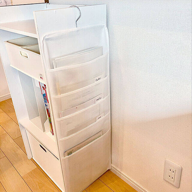カラーボックスの横を活用して書類収納しているsasaeriさんです。使用したのはなんとシャツを吊り下げ収納するアイテム。中にはクリアファイルを入れてお子さんの情報をわかりやすく仕分けしているそうですよ。散らかりがちな書類を、省スペースですっきり収納するアイデアはぜひ参考にしたいですね。