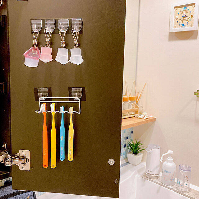 棚に小物類を置くスペースがないときは、つっぱり棒を使って掛けて整理してみてはいかがでしょうか。ネジなどが不要のため、手軽に収納を増やしたいシーンで大活躍します。shiranuiさんは、浴室の扉にバススリッパを収納されています。ケースの中にスリッパを入れるので、水滴が床に落ちないのもうれしいですね。