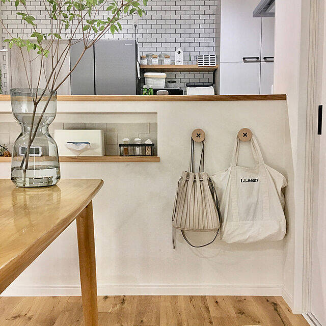 ダイニングの一角に、日常づかいのバッグ置き場を設けていらっしゃった、konatsuさん。デッドスペースになりがちなダイニングの壁面を上手に有効活用されています。バッグのデザインもダイニングのインテリアスタイルにぴったりで、ディスプレイのような効果もありますね。