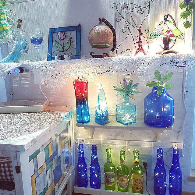 posauruさんは、お気に入りの青い酒瓶の中にフェアリーライトを入れて、ライトアップボトルにアレンジ☆キラキラとした光が青い酒瓶を美しく引き立て、海の中にいるような神秘的な雰囲気ですね。酒瓶のカラーをうまく活かした素敵な実例です。また、地震対策のためにワイヤーで固定するなど配慮もされています。