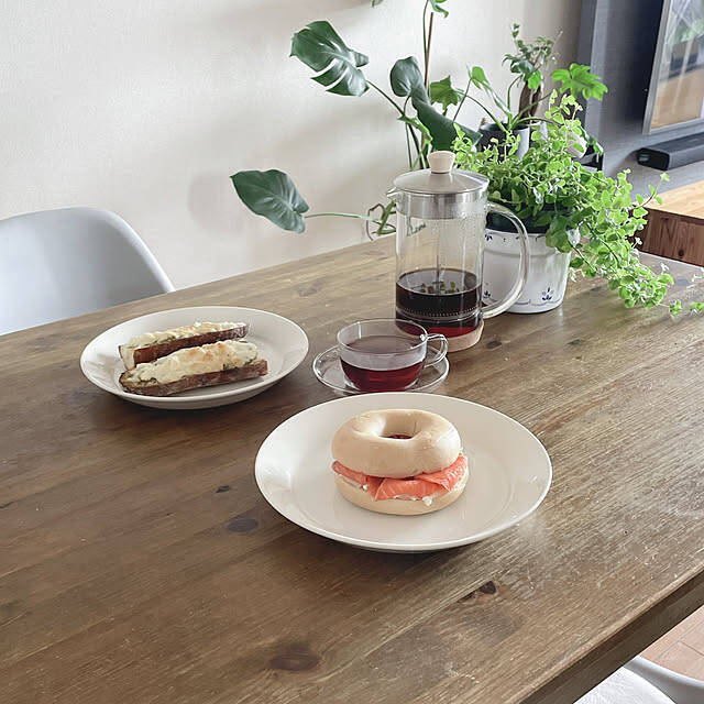落ち着いたカラーの木目が美しい、こちらのテーブル。ユーザーさんは、イッタラのティーマ、23cmプレートに、ベーグルやフランスパンを盛り付けていました。大きめサイズは、食事にもスイーツタイムにも使えそう♪シンプルなデザインの食器は、ユーザーさんのインテリアにも溶け込んでいますね。