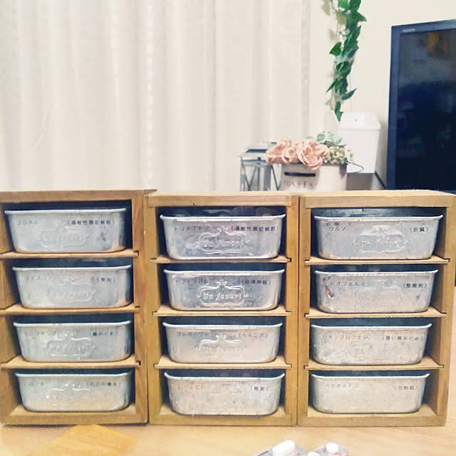 Myuuさんは毎日飲むお薬の管理に、セリアの木箱とブリキのトレイを活用されています。トレイに1種類ずつ薬を分けて収納し、わかりやすくラベリング。トレイの大きさが薬を入れるのにちょうどよく、重宝しているそうです。ナチュラルな雰囲気で、インテリアにもなじみそうですね。