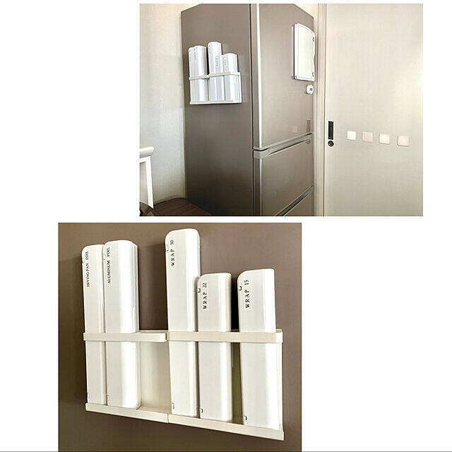 セリアとダイソーのラップケースを使用されているs_homeさん。ケースをホワイトで統一し、シンプルな外観に整えています。サイズや種類ごとにラベルを貼ってわかりやすく仕分けられていますね。ラップだけでなく、アルミホイルやクッキングシートなどにも対応OK。ロゴが隠れることでスッキリとした印象になります。