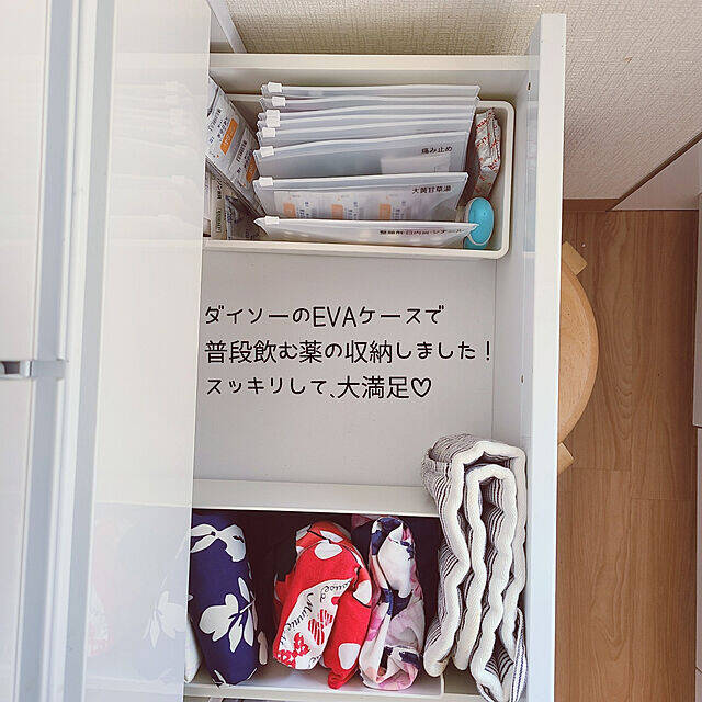 minさんは、ダイソーのEVAケースを使って薬を整理されています。半透明で中身が見やすく、小物類を立てて収納するのに便利。柔らかな素材でスライダーの開閉もスムーズですよ。また、シンプルなデザインなので複数そろえてもスッキリとした印象になります。サイズ展開も豊富なので使い分けがしやすいですね。