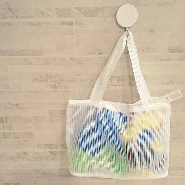 aoiさんはセリアで販売されているスパバッグをお風呂のおもちゃ収納に活用しています。スパバッグはメッシュ素材になっており、水切りができるので湿気がこもりにくい優秀なアイテム。バッグなので取っ手をフックなどに引っ掛けて、吊るして収納できるところもいいですね。