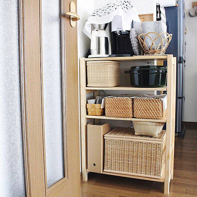 キッチンに58cm幅のパイン材ユニットシェルフを置いている実例です。ユーザーさんは、同じく無印良品の「重なるブリ材長方形バスケット」と「重なるラタン長方形ボックス」を使って、キッチン周りの物を収納していました。カゴ類を組み合わせることで、ナチュラルさいっぱいのキッチン収納になっています。
