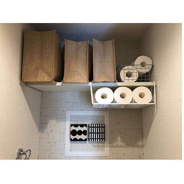 ジュートマイバッグをトイレ内収納に活用しているのは、wakameさんです。トイレットペーパーや掃除用品、生理用品といった、トイレでの必需品を目隠し収納しています。マチがあるので収納力があり、さらに低価格でうれしいことづくしです。優しい色合いで、インテリアにも馴染む収納アイテムですね。