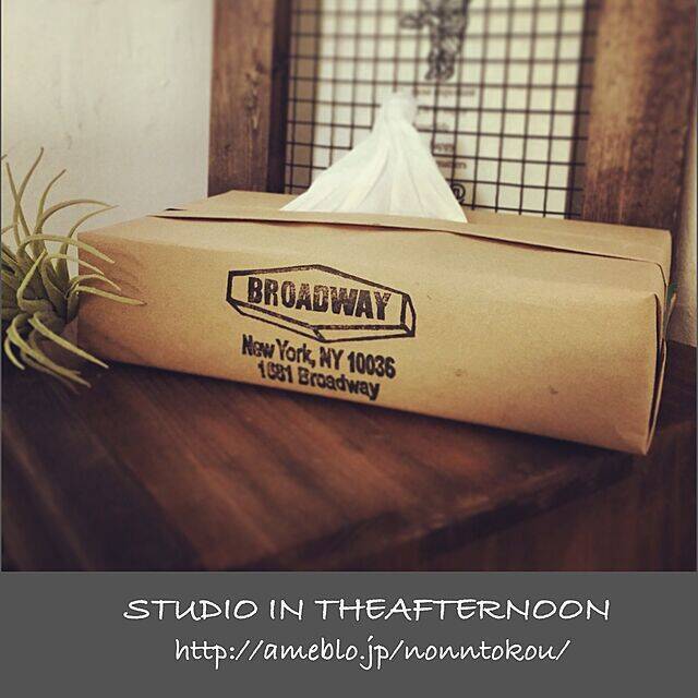 こちらの実例では、紙を使ってティッシュボックスケースを作っています。ニューヨークをモチーフにした消しゴムハンコが押されていて、渋可愛いデザインに仕上がっていますね。隣のエアプランツや後ろのフェンスとも相性抜群です。