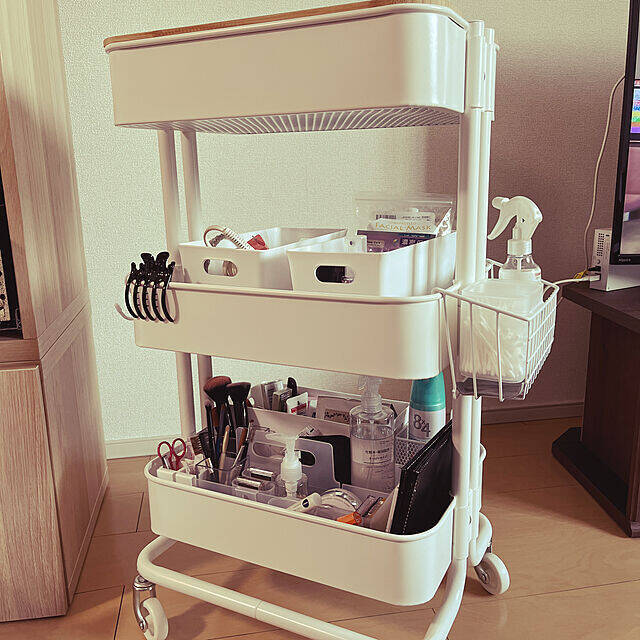 ロースコグにメイク道具とヘアアイロンなどを収納しているユーザーさん。ワゴンの中は細かく仕切られ、化粧道具が取り出しやすく収納されています。朝の化粧とヘアセットは、このワゴン1台で、すべて完了するそうですよ。忙しい朝にピッタリの使い方ですね。