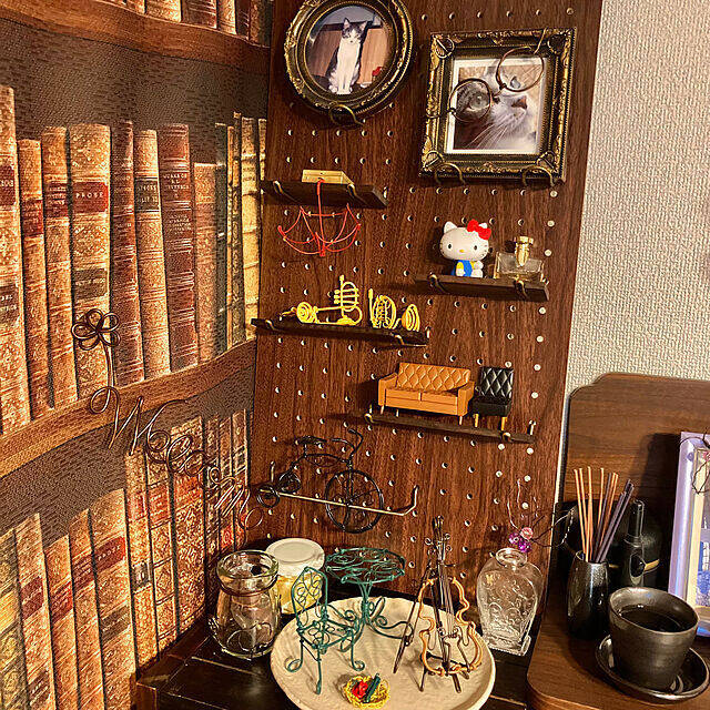 GowBooさんは、ダイソーの有孔ボードにパーツを取り付けて、ディスプレイラックをDIYしています。立派な棚ですが、材料費は1000円かかっていないそうです。BOOKSHELF柄のタペストリーとの雰囲気も合っていて、統一感のある空間ですね。