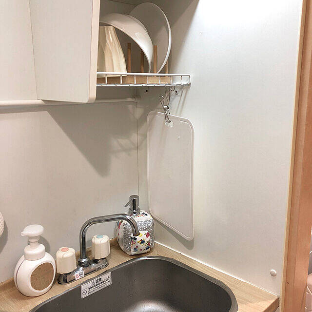 まな板の立てかけスペースが無かった、とおっしゃるこちらのユーザーさん。無印良品の「ステンレスひっかけるワイヤークリップ」を使って、薄手のまな板をシンク上に吊るしていました。場所を取らずにまな板を保管できて、水切れもよさそうですね。