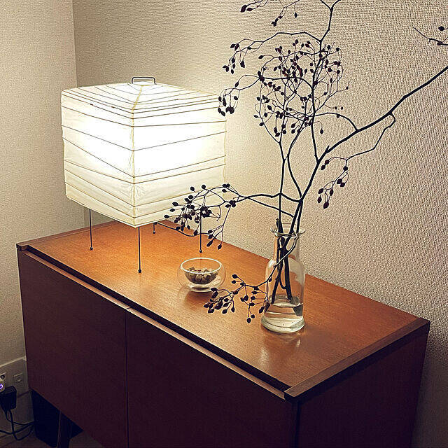 サイコロのような四角柱のシェードに、4本の細い鉄製ワイヤーの脚が付いたAKARIスタンドライトです。ランダムに巻かれた竹ひごが、シンプルな中にリズム感を生み出しています。ユーザーさんは素朴な枝物と一緒にディスプレイ。柔らかな光に浮かび上がる、枝のシルエットが幻想的です。