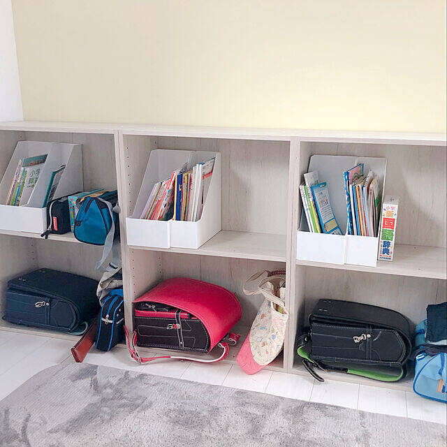 suzucoさんは、ニトリの棚を3つ並べて兄弟3人分のランドセルラックを作っています。ランドセルのほか、絵具セットや手提げバッグもゆとりを持って収納できるサイズ感ですね♪ファイルボックスを使えば、教科書類もすっきりと整頓できますよ。