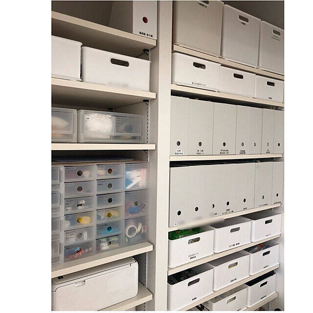 nico-oさんは、マイホームを建てる際に、可動棚付きのリビング収納を作ったそう。ボックス類をシンプルなホワイトで統一しているので、ごちゃごちゃ感がなくとてもスタイリッシュに仕上がっていますね。家族みんなが使いやすいよう、ラベルを貼っているのもポイントです。