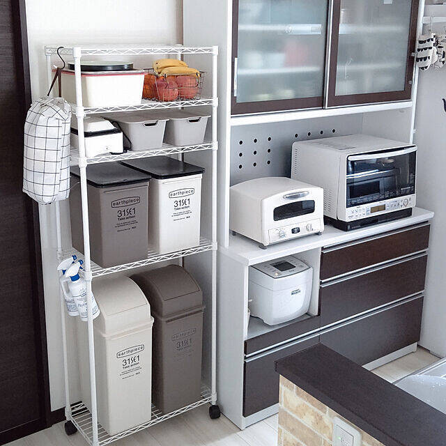 ダークブラウン×ホワイトでシンプルにまとめた、kojikojiさんのキッチンです。置き場所に悩みがちなゴミ箱も、こんな風にスチールラックを使えば、積み重ねてすっきりと収納できますね。横にフックやスプレーボトルを引っ掛けることができる点も魅力です。