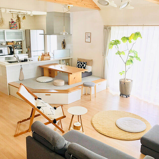 ニトリで購入した木製のリクライニングチェアを置いて癒しスペースを作っているユーザーさんです。ここでまったりしながらコーヒーを飲むのが楽しみだそうですよ。明るいリビングで光に包まれながらのんびりとした時間を過ごせそうですね。
