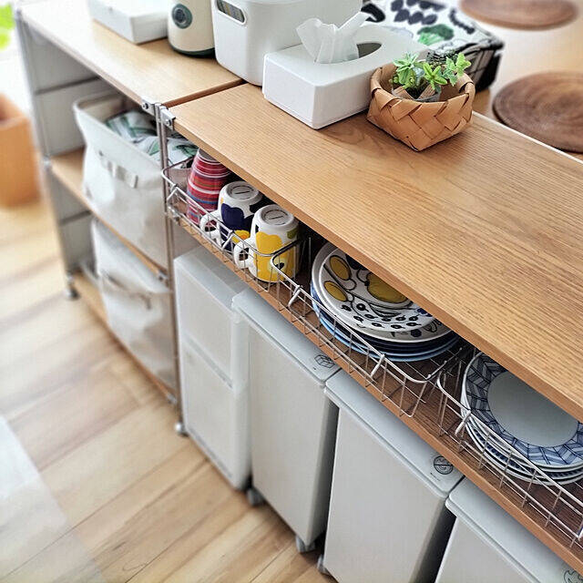 hihaさんは、キッチンカウンターの収納に3COINSのステンレスワイヤーバスケットを愛用しています。バスケットには、お皿やマグカップなど食器類を重ねて入れていました。使うときにさっと引き出せて便利なのだそう。中身が見やすく、すっきりとキレイな収納で気持ちがいいですね。