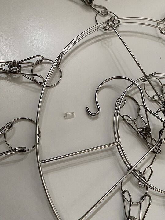 もうひとつのステンレスハンガー16ピンチ丸型も、フック部分のキャップを外して反対側のチェーンの先端を通します。通せたら、またキャップを戻せば完成です。