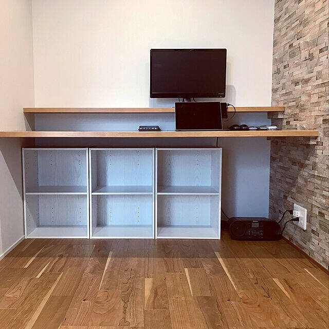 スリムタイプのカラーボックスと、ベーシックなカラーボックスを並べて使っているのはmeeさんです。実例のように色や棚板の位置を合わせると、スッキリして見えますね。同デザインのボックスを入れ込むと、より統一感が生まれます。