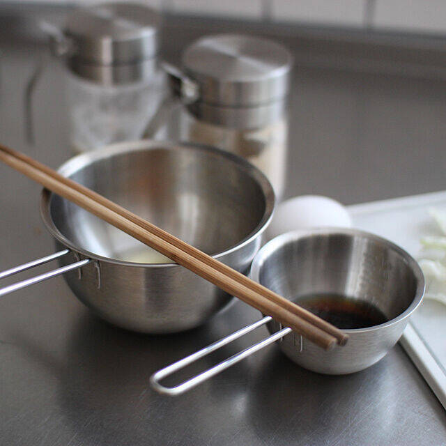 yukkyさんは、「藤井器物製作所の計量カップセット」を使っています。目盛りで測ったあとそのまま調理できる深型の形状で、持ち手を吊るして収納することもできます。「便利すぎて、この計量カップが届いてからボウルの使用率がかなり落ちた」とのことです。