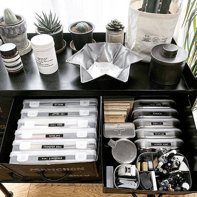 Myuuさんは無印良品の引き出しに、セリアのダストボックスを入れて、大きめのクリップ類を収納されていました。ボックス6個がシンデレラフィットしたそうですよ。フタつきのシンプルなボックスなので、見た目もスッキリとしています。ラベリングをしておけば取り出すときも便利ですね。