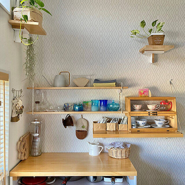 ダイニング側からサッと取れるカトラリー置き場が欲しかったという、satosanさん。キッチンカウンターの上に、ラブリコを使って棚をDIYしています。ちょうどコンセントもあるので、下の部分は電気ケトルが置ける高さに調整して使いやすくしていました。
