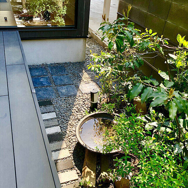 ガーデニングが趣味だというparuさんは、中庭に日陰や半日陰を作ったシェードガーデンにしました。日の光が射し込みにくいからこそ、日陰に強い植物を楽しめるのがいいですね。足もとの細かい砂利を玉砂利に変えて、掃除をラクにしたという。庭作りの工夫も参考になります。