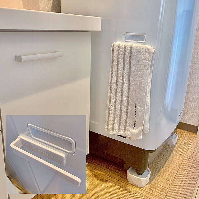 ユーザーさんは洗濯機の側面に、セリアのマグネットボディタオルハンガーを設置。洗面台で手を洗ったお子さんが使いやすいように、低い位置にしたそうです。マグネットタイプは、好きな高さに取り付けられるのがメリットですね。片側がオープンなつくりなので、タオルのセットも楽にできそうです。