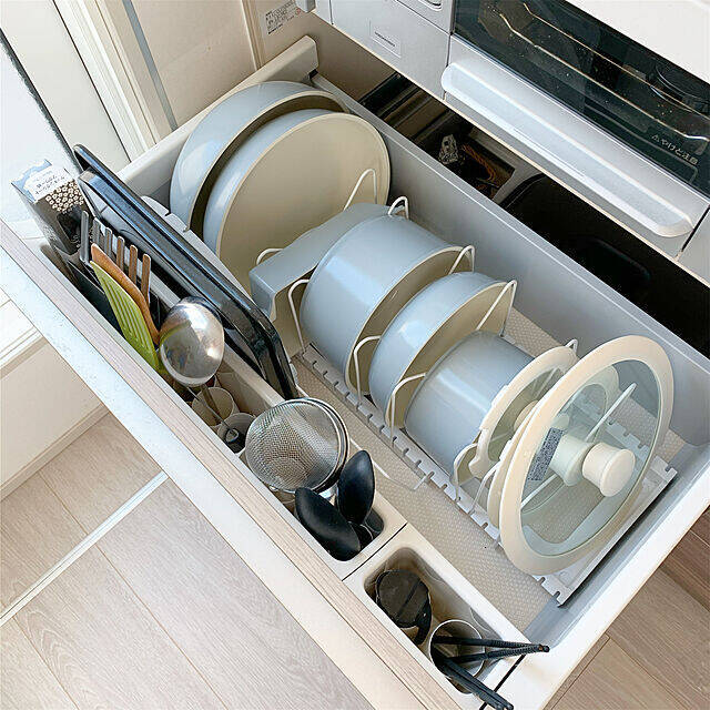 フライパンスタンドを活用し、フライパン類をすっきりと収納している、skyukaさんです。立てて収納できるので、取り出しやすくしまいやすい使い勝手の良い収納を叶えていますね。爽やかなカラーのフライパン類は、清潔感が感じられます。