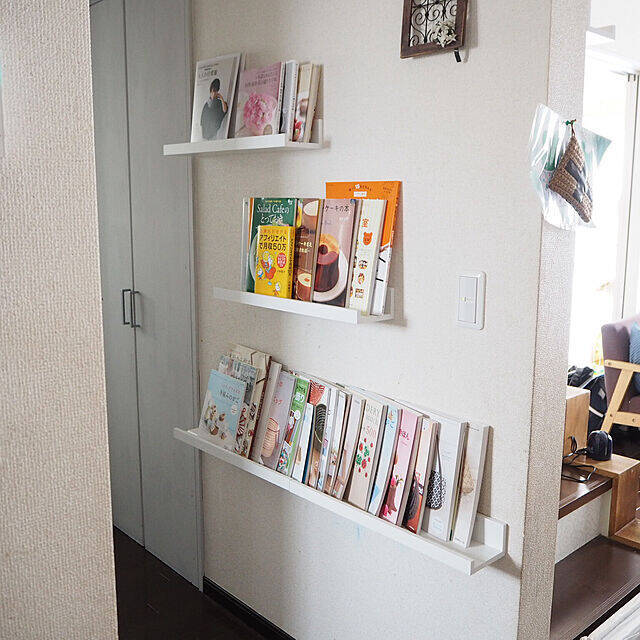 デッドスペースになっている壁にイケアの飾り棚を取り付け、マガジンラックを作ったというrie-cloverさん。複数個の棚を使えば、かなりたくさんの雑誌や本を立てることができますね。表紙を見せながら収納できるので、本を探しやすいうえにインテリアのアクセントにもなってくれます。