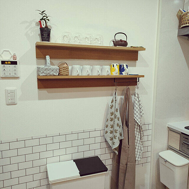 pinponmamさんは、棚タイプをキッチンに2段にして活用されていました。収納しつつディスプレイ効果もあるので、お気に入りアイテムの置き場所に最適です。このように複数個使うことで、壁の彩りや収納量の調整ができるのもいいですよね。棚板の裏にバーを設置してエプロンを引っ掛けるアイデアも必見です。