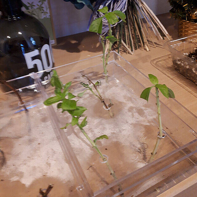 アクリルトレーに穴をあけて、水耕栽培の容器にしているvalleさん。透明のトレーなので、水のきれいさや植物の様子も観察しやすく、水耕栽培にピッタリなアイテムだと思います。100円均一のトレーにひと手間くわえることで、おうちで植物を育てる楽しさが感じられます。真似したくなる魅力的なアイデアですね。