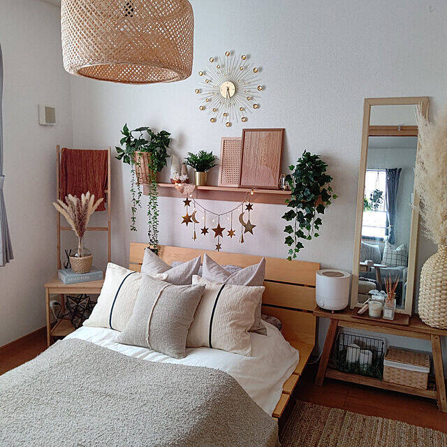 megunyさんは、ベッドルームにZARA HOMEのクッションをたくさん並べて置いています。無地の真ん中にラインが1本入っている、シンプルなデザインです。ナチュラルテイストのお部屋の、ほどよいワンポイントになっていますね。