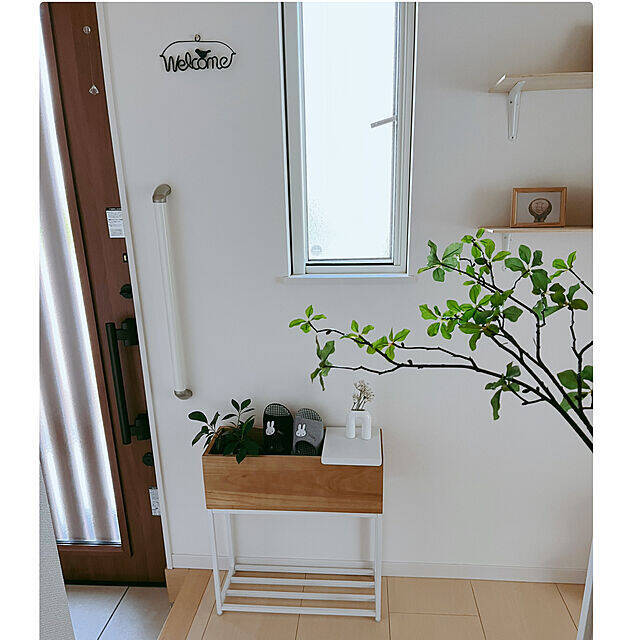 Miyu_さん宅で使用されているのは、株式会社ビギンの「Lidプランターボックス」です。天然木のボックスは、グリーンとも相性抜群ですね。スリッパを収納したり、小物を飾ったりしても◎。ボックスの下が棚になっているのも高ポイントです。