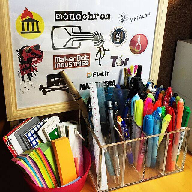 無印良品のアクリルケースをペン立てとして活用している、okyame-chanさんの実例です。仕切りがついているので、マジックやボールペン、鉛筆と種類ごとに収納できるところがとても使いやすそうですね。高さもちょうど良く、取り出しやすく片付けやすい収納になっています。
