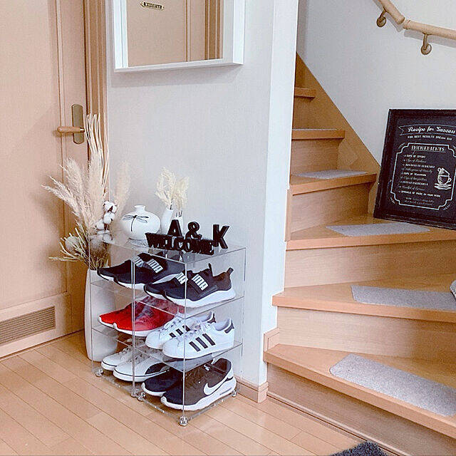 シューズラックタイプのアクリルケースを使っているkazuさん。アクリルケースのクリア感はとてもスタイリッシュで、クールな玄関まわりが演出されています。お気に入りの靴を飾りたくなるデザインで、インテリアとしても収納を楽しむことができそうですね。