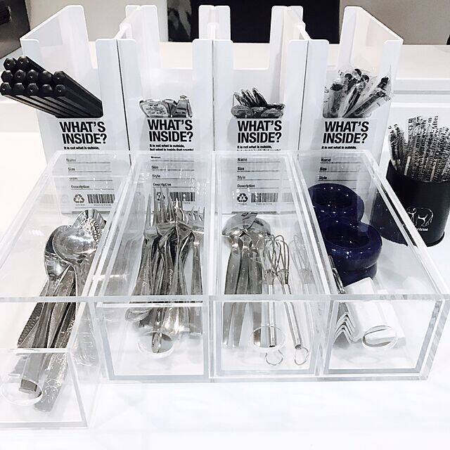 まず初めにご紹介するのは、アクリルケースを使ったキッチン用品の収納方法です。フリーザーバッグやカトラリーなど、かさばりやすいアイテムもアクリルケースを使えば、使いやすくスッキリとした収納を実現することができます。さっそくチェックしていきましょう。