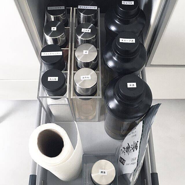 アクリルケースを活用して調味料を収納しているa.organizeさん。仕切りがあるので、中で調味料ボトルが動くことなく置けるところが魅力です。上から見ても分かりやすいように、蓋の部分にラベリングをされました。取り出しやすい工夫をプラスすることで、より使いやすい収納になりますね。